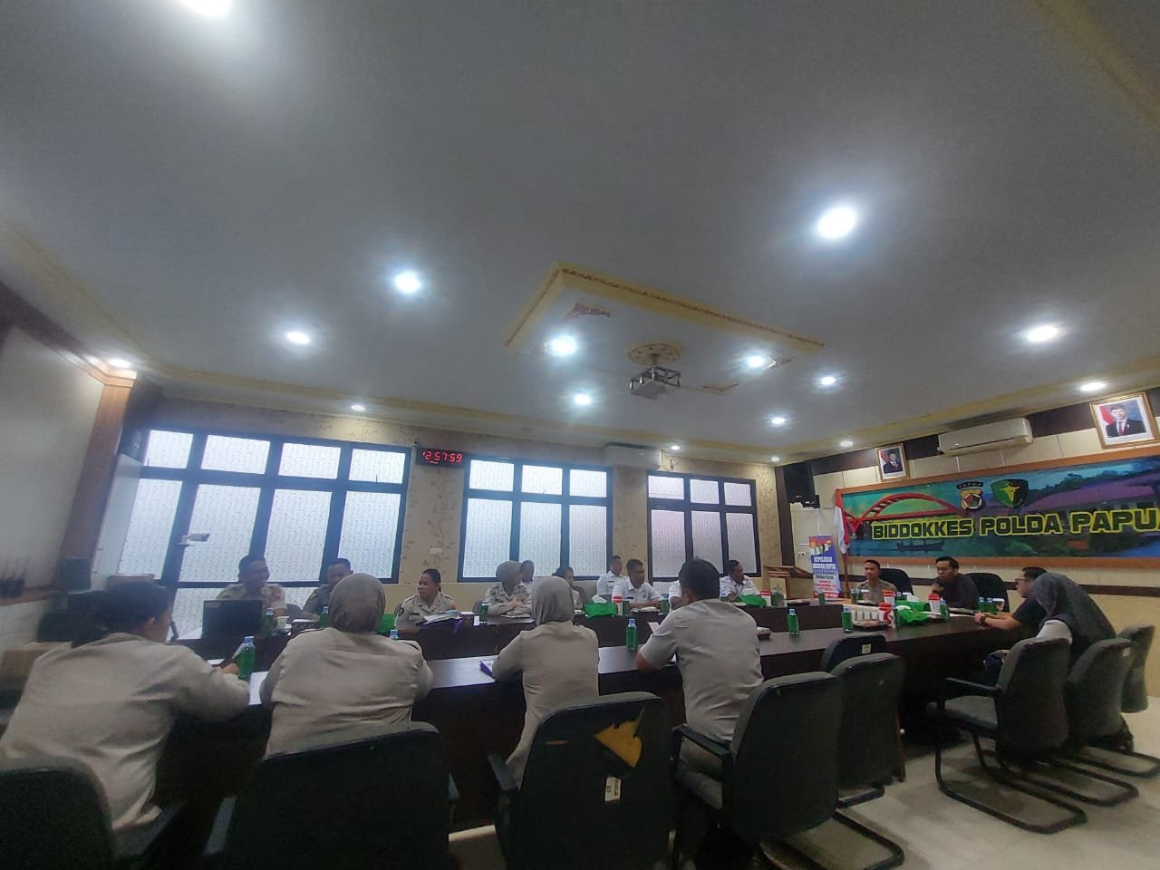 Kegiatan pemeriksaan berlangsung di Aula Biddokkes Polda Papua dan dihadiri oleh Kabiddokkes Polda Papua Kombes Pol dr. Bambang Pitoyo Nugroho, KA Rumkit Polda Papua Dr. Rommy Sebastian, dr., M.Kes., M.H., CPM., QHIA, serta para pejabat dan staf Biddokkes dan Rumkit Polda Papua.