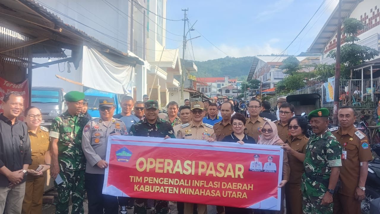 Bitung – Dandim 1310/Bitung Letkol Inf Dewa Made DJ, bersama unsur Forum Koordinasi Pimpinan Daerah (Forkopimda) Kab. Minahasa Utara, turun langsung ke pasar untuk melakukan operasi pasar dan pasar murah jelang Natal 2025 dan Tahun Baru 2026, Selasa (16/12/2025).