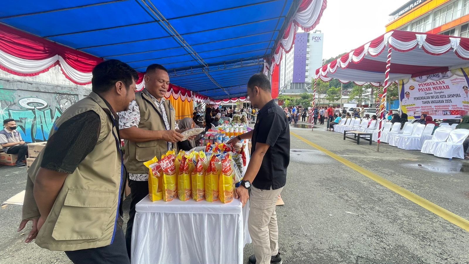 Papua – Kegiatan Gerakan Pangan Murah (GPM) Serentak digelar di Halaman Parkir Sip Azana, Kota Jayapura, Kamis (26/2/2026) pukul 09.00 WIT. Kegiatan tersebut dihadiri oleh Wali Kota Jayapura, Asisten II Bidang Perekonomian dan Pembangunan Provinsi Papua, Biro Perekonomian dan Administrasi Pembangunan Provinsi Papua, Dansatrol Lantamal X, Kodim 1701, Dinas Pertanian, Dinas Kelautan dan Perikanan Provinsi Papua, Dinas Perindustrian dan Perdagangan Provinsi Papua, Dinas Komunikasi dan Informatika Provinsi Papua, Kantor Bank Indonesia, Perum Bulog, serta Satgas Pangan Polda Papua.