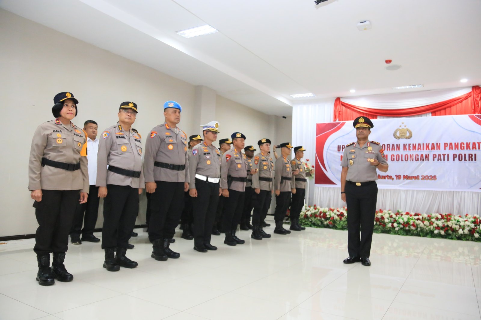 Manokwari – Kepolisian Daerah Papua Barat menggelar Upacara Korp Raport Kenaikan Pangkat ke dalam golongan Perwira Tinggi (Pati) Polri yang dilaksanakan secara daring bertempat di Ruang Vicon Lantai 2 Polda Papua Barat. Upacara ini menjadi momen istimewa dengan kenaikan pangkat Kapolda Papua Barat setingkat lebih tinggi dari Brigadir Jenderal Polisi (Brigjen Pol) menjadi Inspektur Jenderal Polisi (Irjen Pol). Kamis, (19/3)
