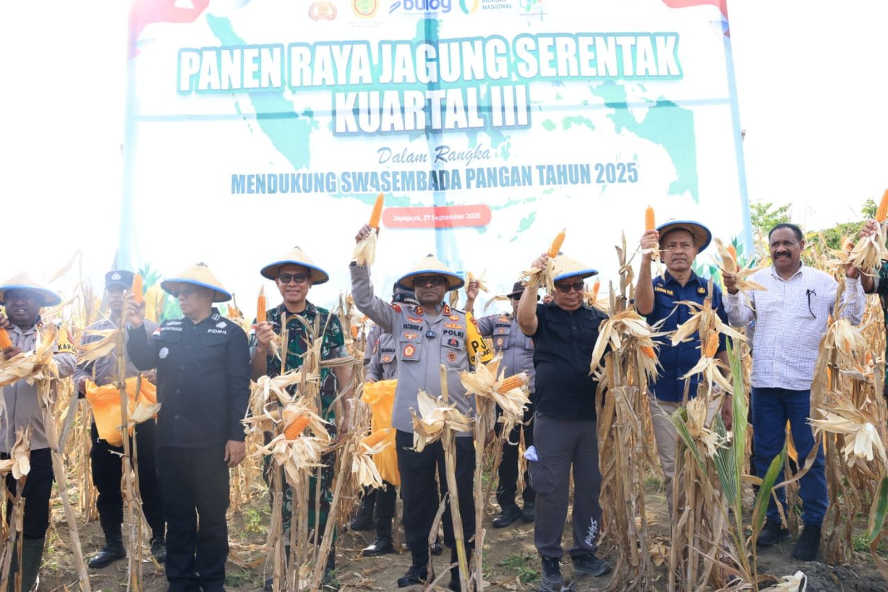 Papua – Kepolisian Daerah Papua bersama TNI dan Pemerintah Daerah melaksanakan Panen Raya Jagung Kuartal III Tahun 2025 di Kampung Aib, Distrik Kemtuk, Kabupaten Jayapura. Kegiatan ini merupakan bagian dari program nasional dalam mendukung swasembada pangan serta mewujudkan ketahanan pangan berkelanjutan, Sabtu (27/9).