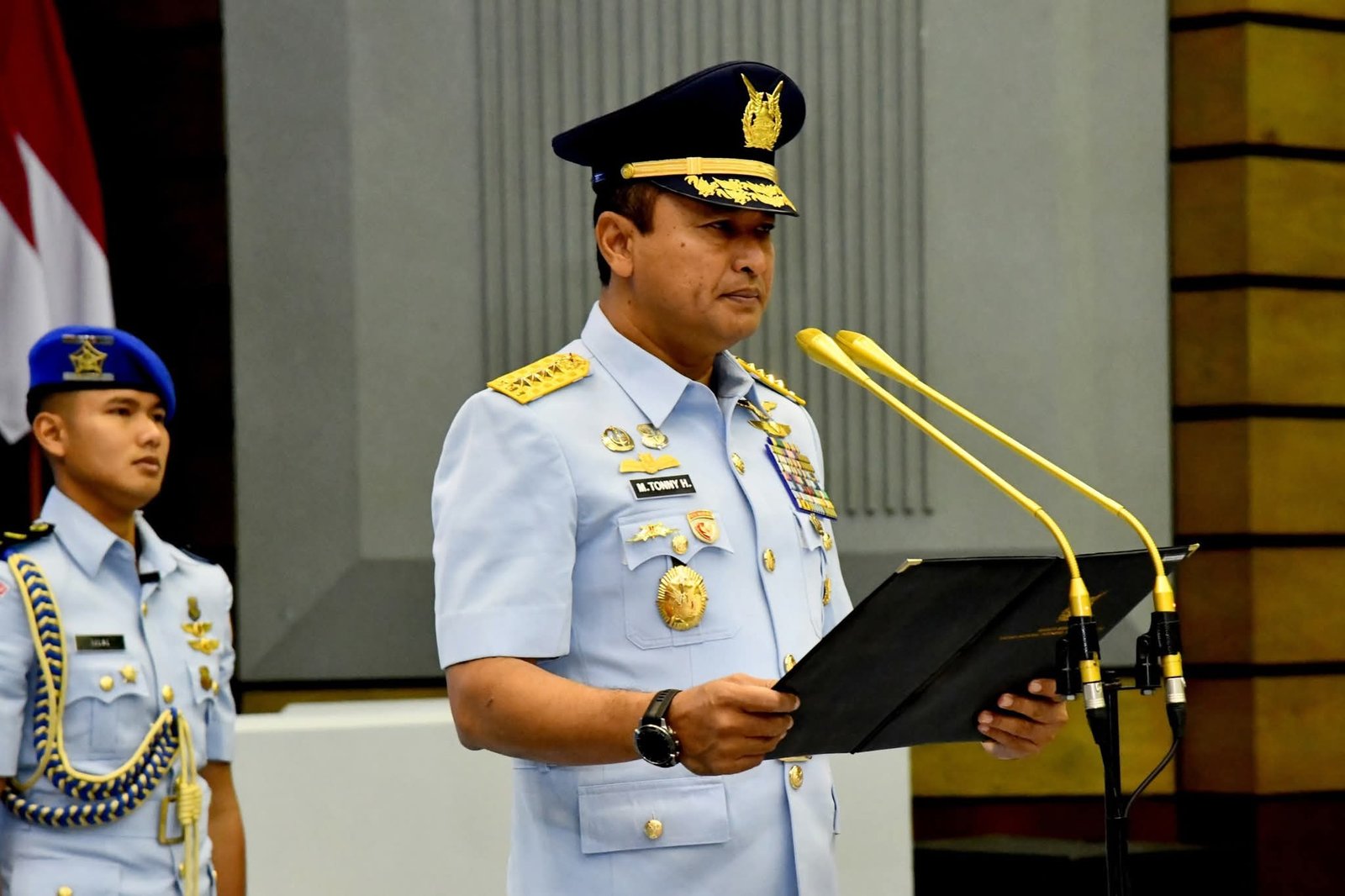 Jakarta – Kepala Staf Angkatan Udara (Kasau) Marsekal TNI M. Tonny Harjono, S.E., M.M., memimpin serah terima jabatan (Sertijab) Kepala Dinas Pendidikan TNI Angkatan Udara (Kadisdikau) dan penyerahan jabatan Kepala Dinas Psikologi TNI Angkatan Udara (Kadispsiau) di Auditorium I.G. Dewanto, Mabesau Cilangkap, Jakarta Timur, Kamis (30/10/2025).