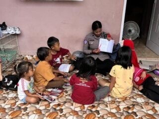 Dalam suasana penuh keakraban, IPTU Agus Iriansyah berinteraksi langsung dengan anak-anak sambil membagikan buku tulis dan buku bacaan.