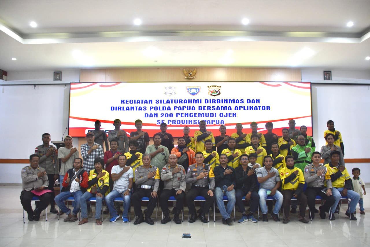 Papua – Polda Papua melalui Direktorat Binmas dan Direktorat Lalu Lintas menggelar kegiatan silaturahmi bersama para aplikator serta kurang lebih 200 pengemudi ojek online dan ojek pangkalan se-Provinsi Papua. Kegiatan berlangsung di Aula Rastra Samara Mapolda Papua Lama, Jumat (21/11/2025).