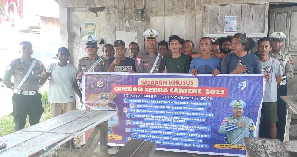 Papua – Dalam rangka mendukung pelaksanaan Operasi Zebra Cartenz 2025, Satuan Lalu Lintas Polres Sarmi melaksanakan kegiatan pembinaan dan penyuluhan (binluh) kepada komunitas mobil rental di wilayah Mararena, Kabupaten Sarmi, pada Minggu (23/11/2025).