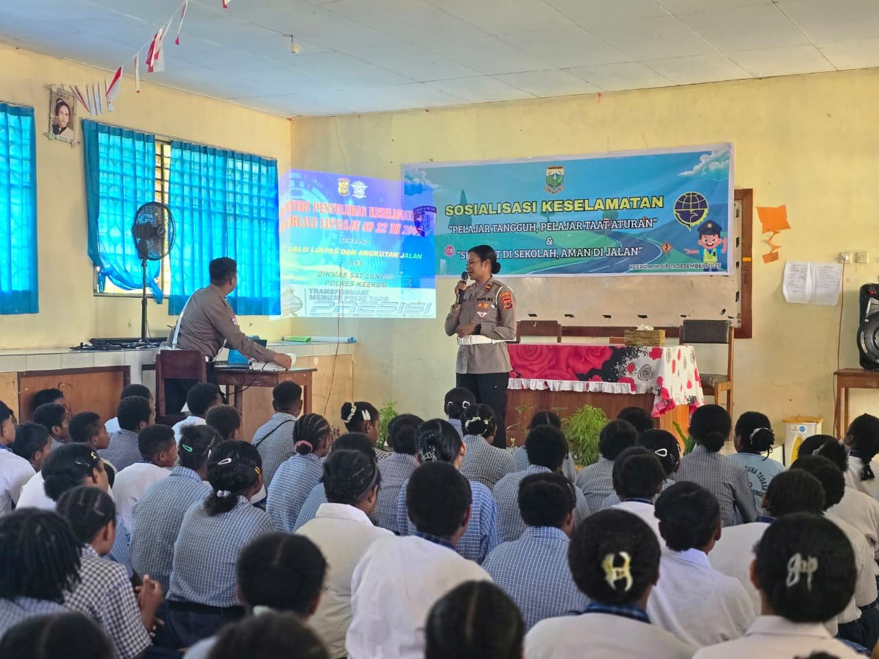 Papua – Satuan Lalu Lintas Polres Keerom melaksanakan kegiatan sosialisasi keselamatan berlalu lintas di SMP YPPK Taruna Tegasa, Arso Kota, Kabupaten Keerom, Rabu (10/12/2025).