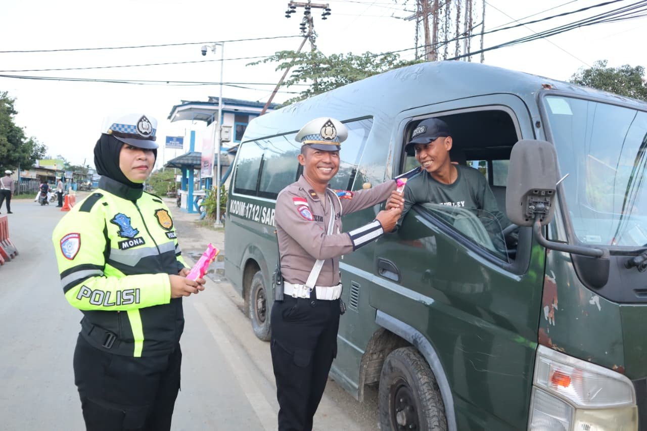 Papua – Dalam rangka memperingati Hari Kasih Sayang yang bertepatan dengan hari ke-14 pelaksanaan Operasi Keselamatan Cartenz 2025, Satuan Lalu Lintas Polres Sarmi menggelar kegiatan simpatik dengan membagikan bunga dan cokelat kepada para pengguna jalan di depan Pos Lantas Kelapa Satu, Minggu (15/2/2026).