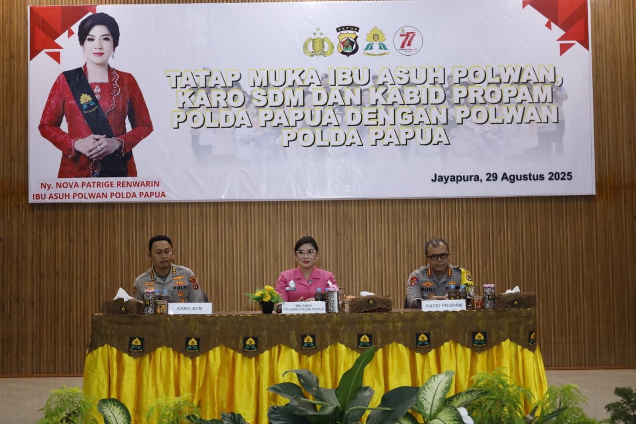 Papua – Dalam rangka memperingati Hari Jadi ke-77 Polisi Wanita (Polwan) Republik Indonesia Tahun 2025, Ketua Bhayangkari Daerah Papua sekaligus Ibu Asuh Polwan Polda Papua, Ny. Nova Patrige Renwarin, menggelar tatap muka bersama para Polwan Polda Papua di Aula Elsama Numberi SPN Polda Papua, Jumat (29/8).