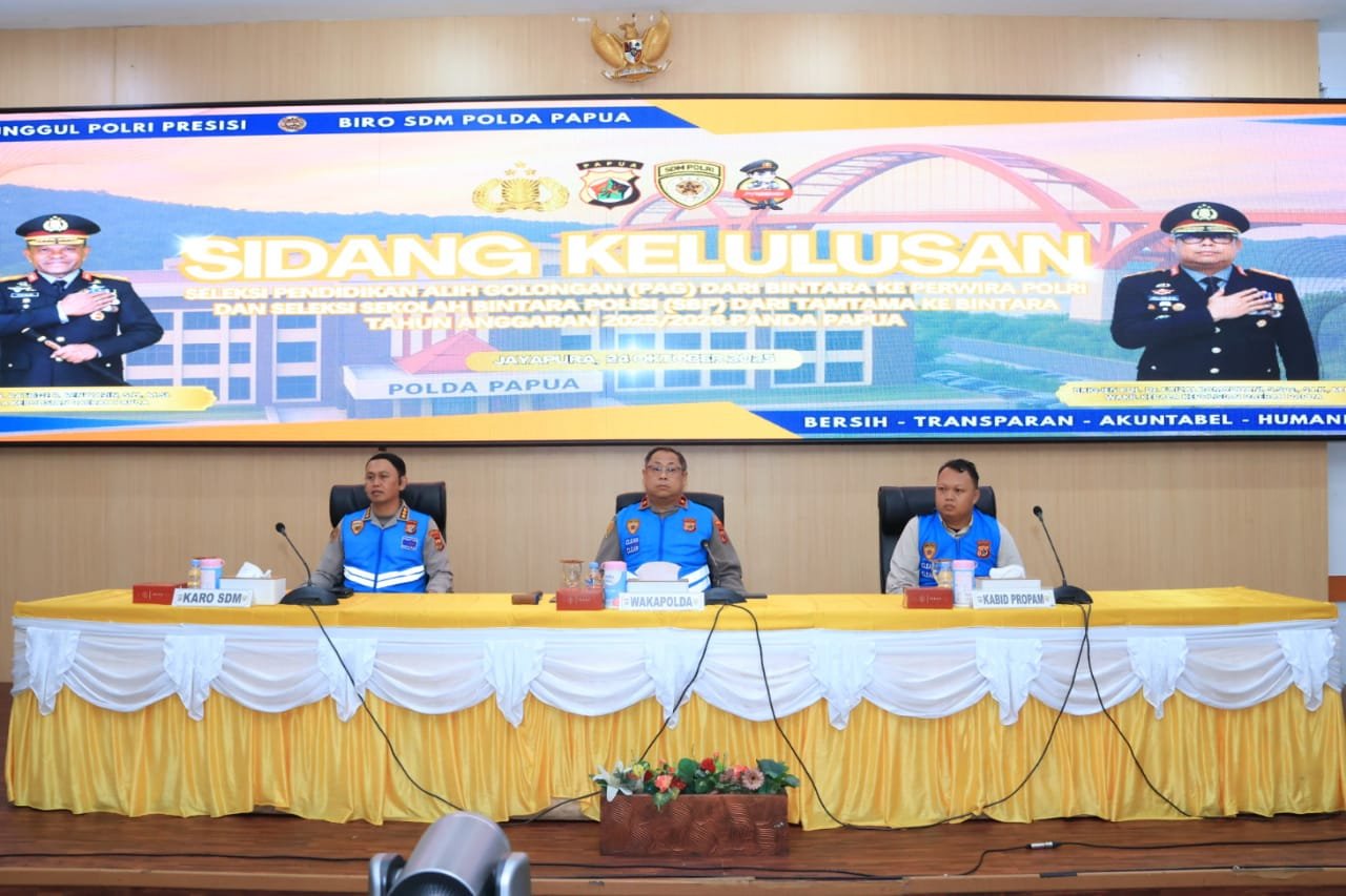 Papua – Wakapolda Papua, Brigjen Pol. Dr. Faizal Ramadhani, S.Sos., S.I.K., M.H., memimpin langsung Sidang Kelulusan Seleksi Pendidikan Alih Golongan (PAG) dari Bintara ke Perwira dan Seleksi Sekolah Bintara Polri (SBP) dari Tamtama ke Bintara Tahun Anggaran 2025/2026, bertempat di Aula Rastra Samara Polda Papua, Jumat malam (24/10/2025).