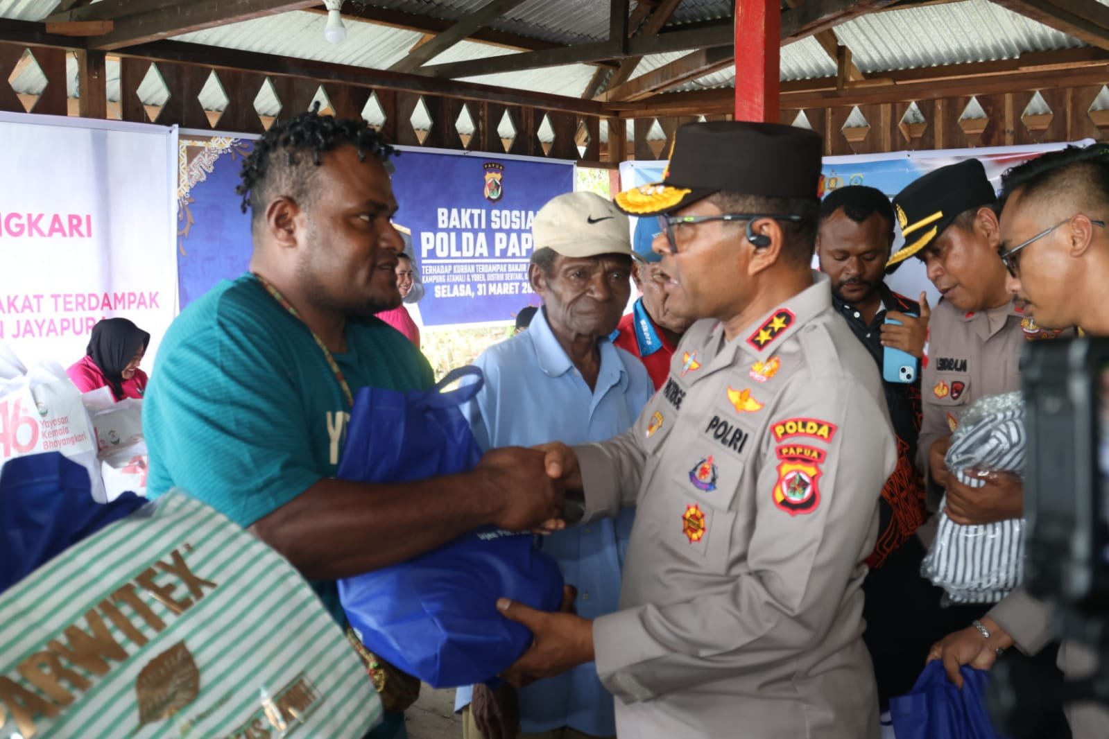 Kapolda Papua, Irjen Pol. Petrus Patrige R. Renwarin, S.H., M.Si., bersama Ketua Bhayangkari Daerah Papua Ny. Nova Patrige Renwarin dan Pejabat Utama (PJU) Polda Papua menyalurkan bantuan sosial kepada warga di Kampung Yobeh, Kampung Atmali, dan Kampung Ifele, Kabupaten Jayapura, Selasa (31/03/2026).